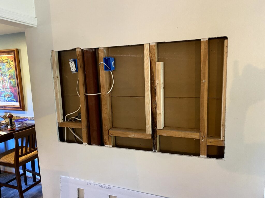 Cutting holes in walls, not as scary as you think. My initial plan was to have the TV insert into the wall, remove the 2×4’s and create a pocket for it to sit in. However discovering a steel beam sort of stopped that in its tracks. I did however, install 1/4 sheetrock instead of the normal 1/2 inch which set the entire unit closer to the wall by a whopping .25 inches!