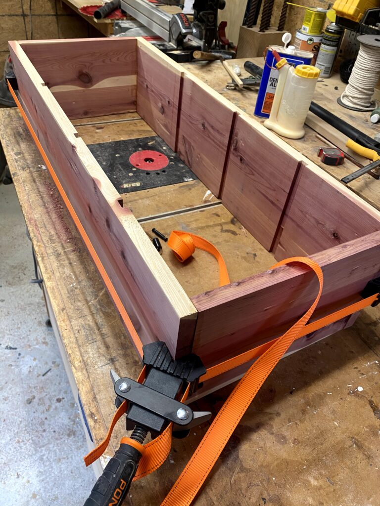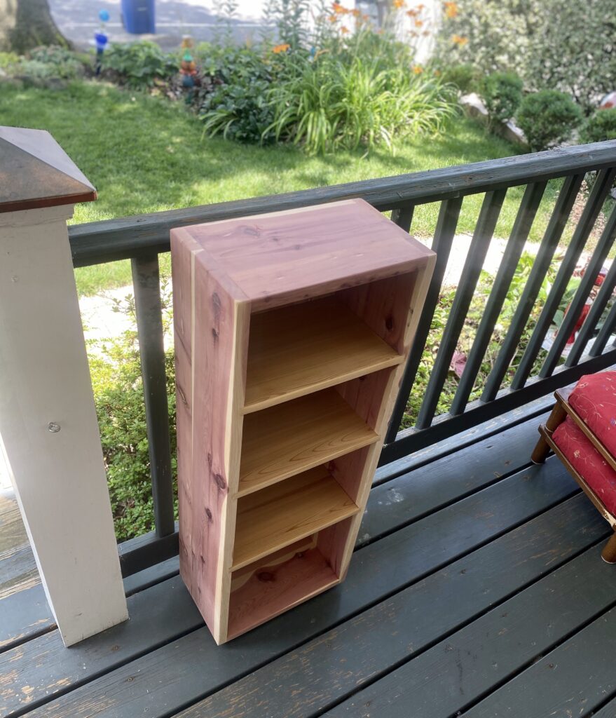 I considered the space and the activities of the family (they hike, cycle and spend quality time outdoors) So I picked up some nice eastern cedar. I love cedar and it was perfect for this project. I cut dado’s for the shelves and did a simple glue up, no finish just a nice sanding and simple 1/8 round over. A simple design but very unique.