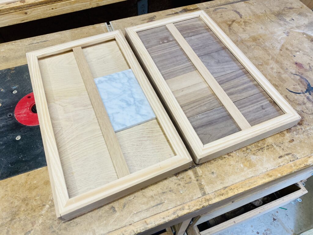 I effectively made to frames hinged them together. I held the marble samples down by a center “T. The T will be held down with a few screws, remove the center pieces and the samples could be replaced.
