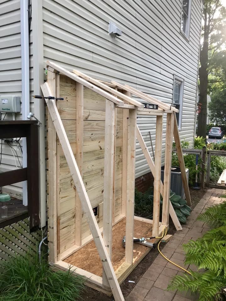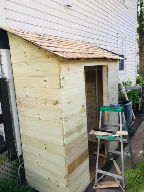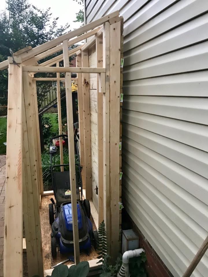 A trip to Lowes, a visit to myoutdoorplans.com and a weekend, was what I planned and for the most part I was correct, except it was more like 6 trips to Lowes. Built out of 2×4, cedar slats for the walls and cedar shingles the construction was pretty straight forward. I put my nail guns to use and had the rear wall assembled in about 2 hours. The shed was to set against the home where the spigot lived I boxed out a window for it’s access, since that spigot was merely a supply line to a front and rear garden hose spigots this was not a hindrance, plus the shed would winterize the spigot in winter, a bonus as no one wants a frozen spigot. I carefully chose the roof angle, meaning whatever I ended up with worked, decided of the door size and before I knew it I had my mower in it’s caddy.