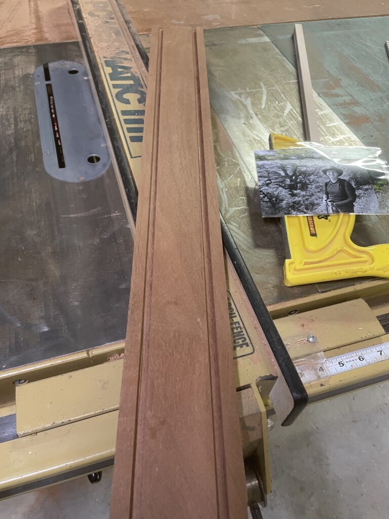 I decided to use sapele with an inserted maple section that had dentil molding work (dentil molding is a type of wooden trim that has blocks shaped like teeth). For the life of me I couldn’t get the corners to look right where the dentil molding connected, so I decided to scrap that idea and go with a smooth maple insert. Next, was the task of making a stand, not wanting the typical leg, I decided to use a thin sapel panel, with a tab that would insert into a base, it would also serve as the backing to hold the photograph and glass in place.