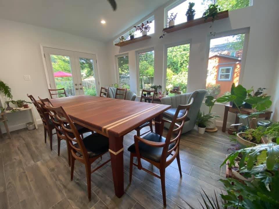 I started a few years back with cutting boards, then benches, picture frames, coffee tables, vanities and tons of lil speciality items along the way. That entire time in the back of my head was this project, this dining room table. Now that it’s done I can say that it’s not the most complex thing I have ever made, but I can say it’s the heaviest 🙂 The table top is nearly 2 inches thick, the legs are thick, 3 inches squared, the expansion slides are solid maple and can be extended to handle, 4- 15 inch leaves (which would not actually fit in our current dining room) the finish is a special wax that takes a week to setup and its smooth to the touch. I could show you a ton of build photos, from milling, to tapering, to assembly, but in the end I most excited to show you these two images: