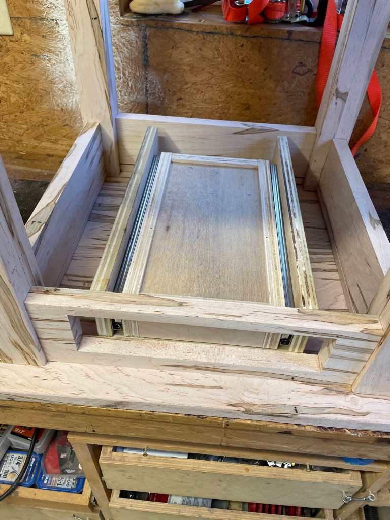 First, I found a section of the wood and chose it for the drawer. I wanted it to blend in when closed. To make this effect, I used a scrap piece of plywood to make a dummy drawer front then transferred it to the maple. (you can see the pencil marks) I briefly considered trying to cut out the center drawer with a copping or jig saw, but I ended up with the more precise table saw, then glued up the pieces. To keep the drawer face from sticking I wrapped it in plastic wrap.