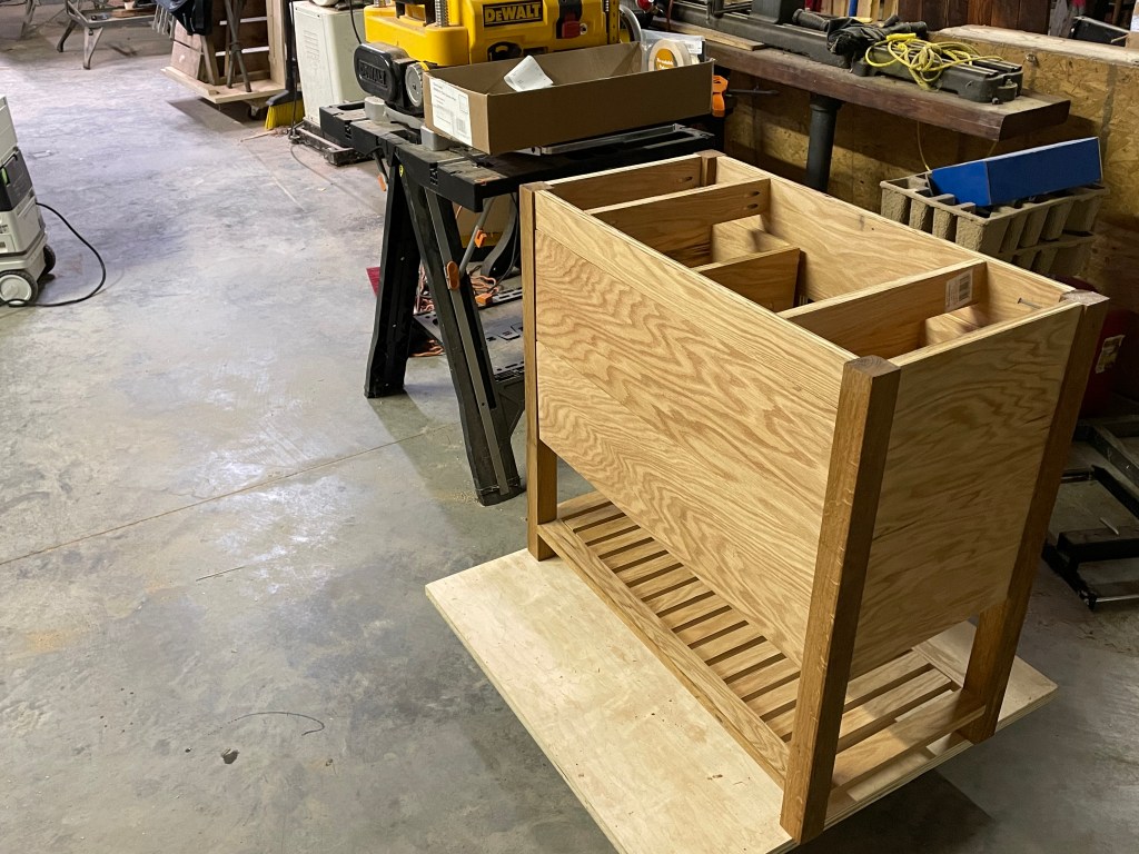 I used reclaimed oak for the legs and 3/4 oak plywood for the rest. The drawers where the hard part. People should understand that there is PLUMBING below the sink, so if you want drawers they need to be made with a notch, that the drawer basically folds around the plumbing when closed, not as simple as one thinks, and not as complex as I would tell you if you ask me to build you one ;). Try to find a vanity with drawers at a big box store, and you’ll be looking for a long time.