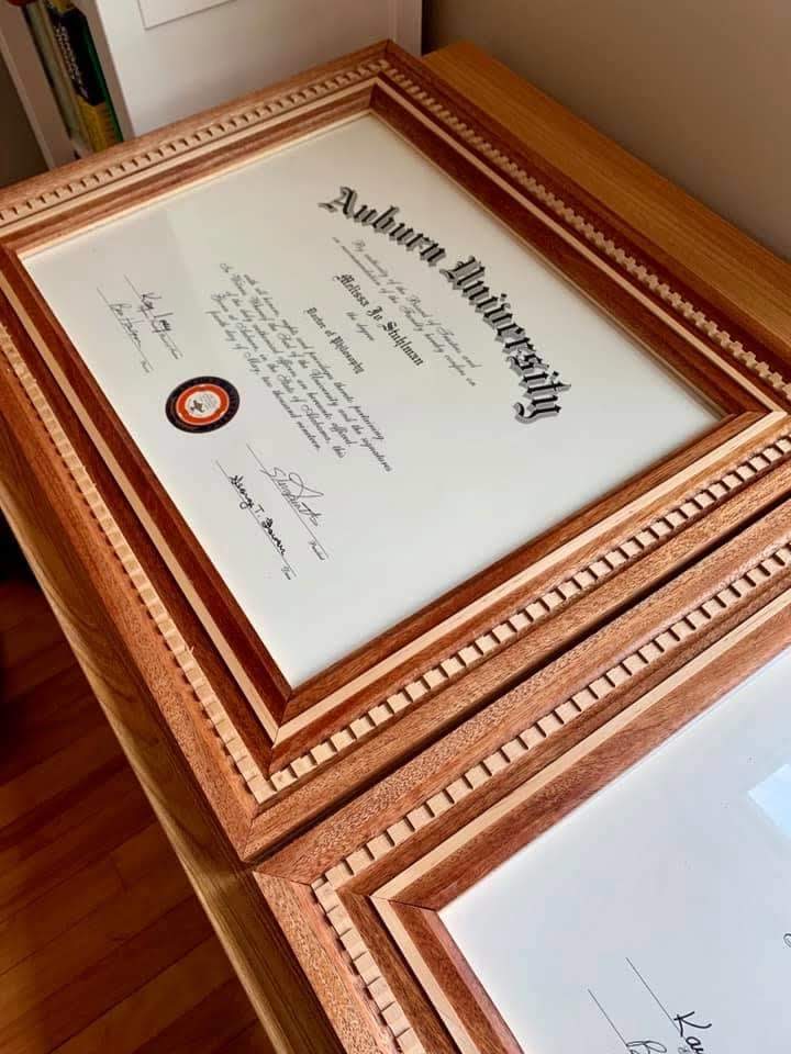 When a couple trust you to make frames for their college diplomas, you actually do measure everything twice! I started with mahogany and maple and ended with 2 identical frames. I met Melissa and Joe at one of our Jefferson Manor neighborhood events where I told them about my small woodworking shop. They reached out