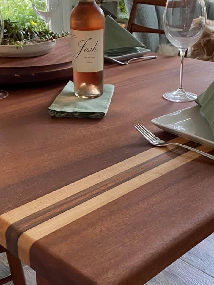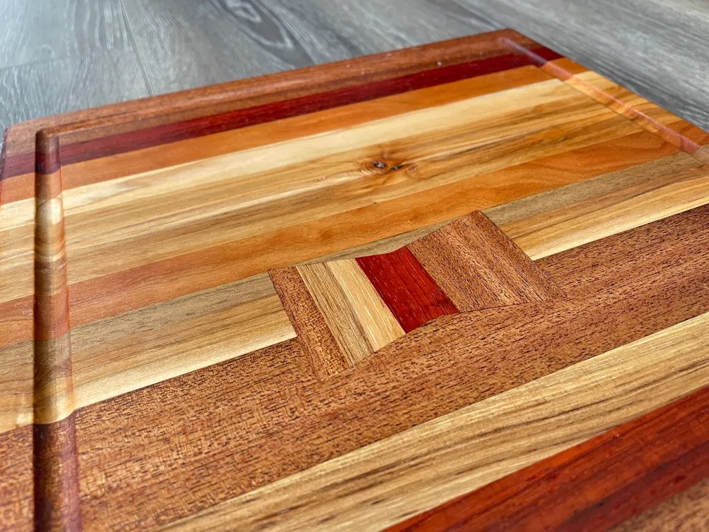 Kristi and I enjoy having people over, and as you know everything revolves around the kitchen, and the kitchen is centered around the cutting board. I use many hardwoods in my cutting boards, from maple, walnut, ash, red oak, white oak, maghony, purple heart, cherry and padauk. I love combining these woods with their natural