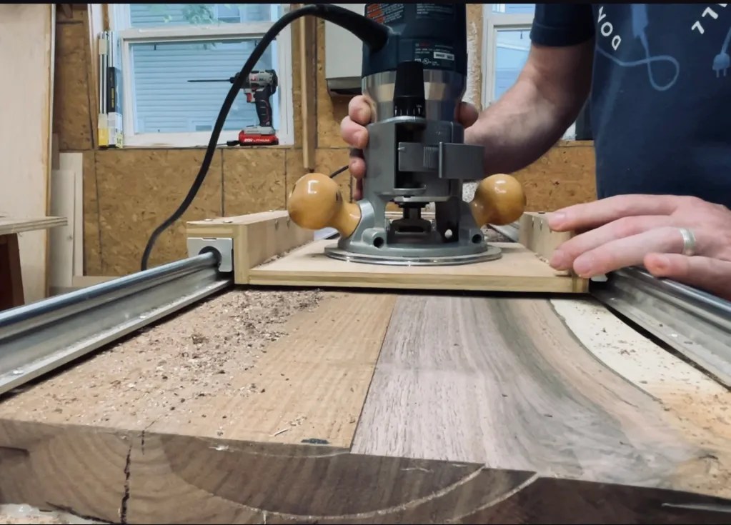 Working with large slabs, requires a different method to get the wood flat. Typically I work with thinner wood that fits on my jointer or through my planner. Things change when it comes to live edge slabs, especially when the project calls for live edges on both sides. This slab I’m working with, while not